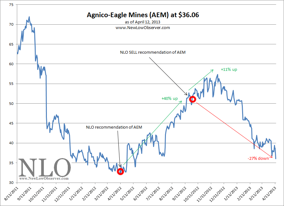 After our recommendation of AEM on April 6, 2012, the stock rose nearly +40%. When we gave the sell recommendation of AEM on September 25, 2012, the stock increased an additional +11%. However, as of April 12, 2013, AEM is down –27% from our sell recommendation and down –37% from the November 2012 high at $57.33.