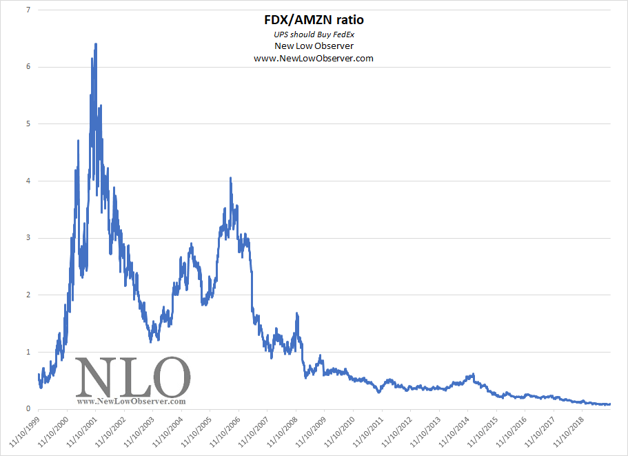 For UPS, this is the ideal time to make an offer for FedEx as FDX lingers at 2005 levels. UPS being unwilling or unable to seize on FedEx at this time (too steep a price at any level) may be the opening for Amazon. Looking at the relative price of FDX/AMZN since UPS went public has the following skewed scenario.