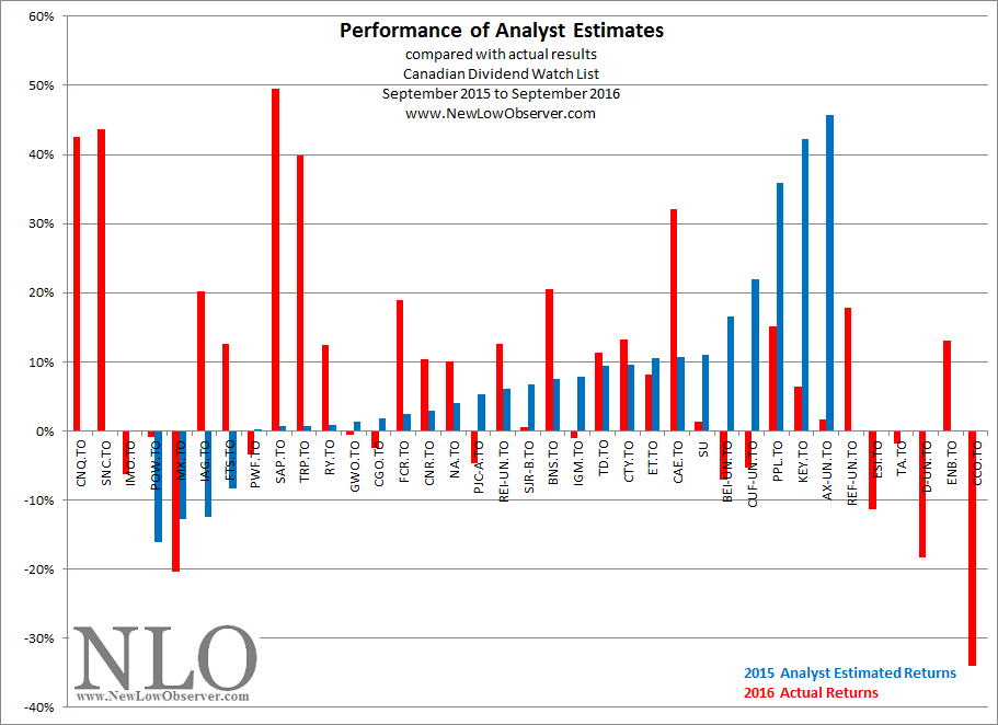 The analysts were off target for their 1-year projections. Only Canadian REIT (REF-UN.TO) and Boardwalk REIT (BEI-UN.TO) came close (somewhat) to the analyst targets.