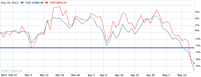 On May 17, 2012, the Dow Jones Transportation Index fell to the closing low of 4,938.18. On May 18, 2012, the Transports fell to the closing low of 4,873.76. This was significant in that it was below both the 5,047 level and below the 200-day moving average.