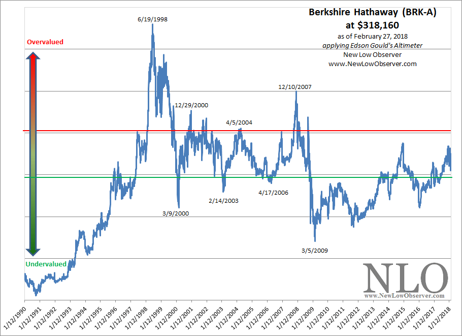 The valuation targets for Berkshire Hathaway (BRK-A) are based on an implied dividend growth rate of 9.90% and applied to Edson Gould’s Altimeter. This is based on a 2012 model which has achieved all upside and downside targets since. A graphical representation of the overvalued, fair value, and undervalued levels are below.
