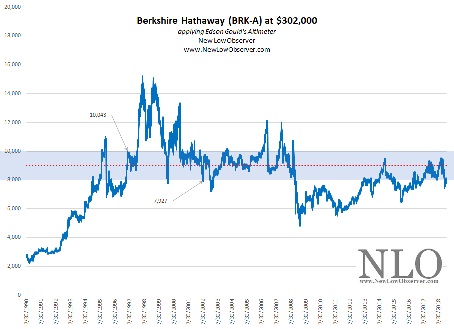 In our May 6, 2012 posting on Berkshire Hathaway (BRK-A) titled “Should Berkshire Hathaway Be Trading at 1995 Prices?”, we gave price projections based on Edson Gould’s Altimeter using very conservative estimates if BRK-A paid a dividend.
