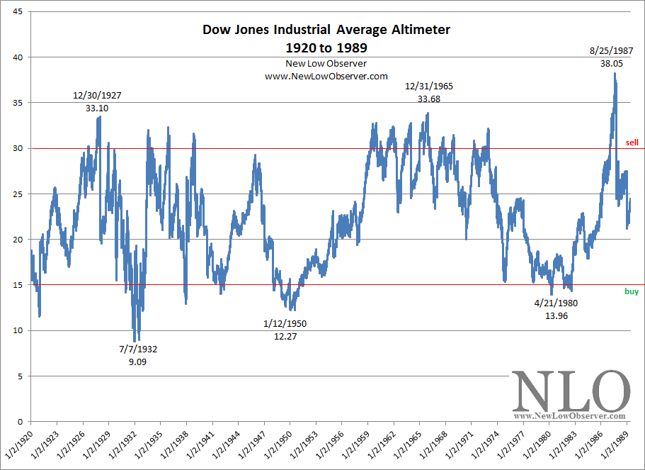 In the period from 1920 to 1989, the Dow Jones Industrial Average would consistently be undervalued or overvalued at set Altimeter levels (15 and 30, respectively).  An investor could almost count on these general points to accumulate and sell stocks without fail.  Note the various dates when a “sell” or “buy” indication was given.  All points until after 1987 were useful indications for market under or over valuation.