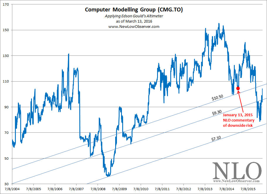 According to the available data, CMG.TO managed to trade as low as $7.67 on January 26, 2016, this was within 5% of our targeted worst case scenario of $7.30. Below is an updated Altimeter for CMG.TO.