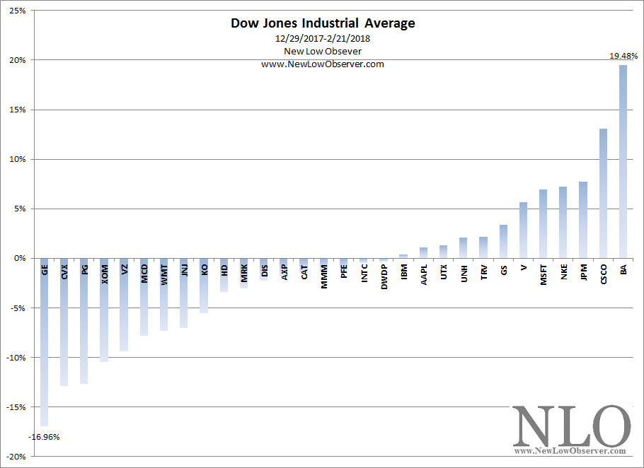 Below is the performance of the individual Dow Jones Industrial Average constituents from December 29, 2017 to February 21, 2018.