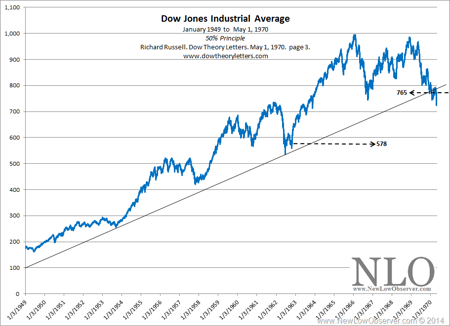 The following from Richard Russell’s Dow Theory Letters is what we believe to be one of the most valuable examples of Charles Dow’s 50% Principle in action.