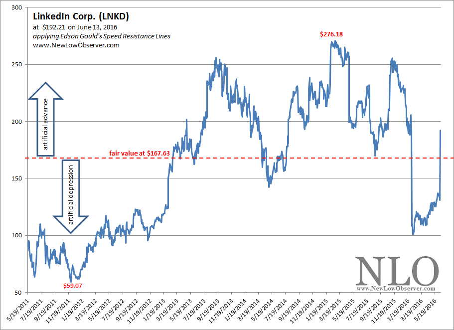 When looking at the price movement of LinkedIn, it is easy to identify the artificial advances and depressions. However, to determine the fair value, a price which long-term holders of the stock have, on average, acquired the stock, we look to the middle point.