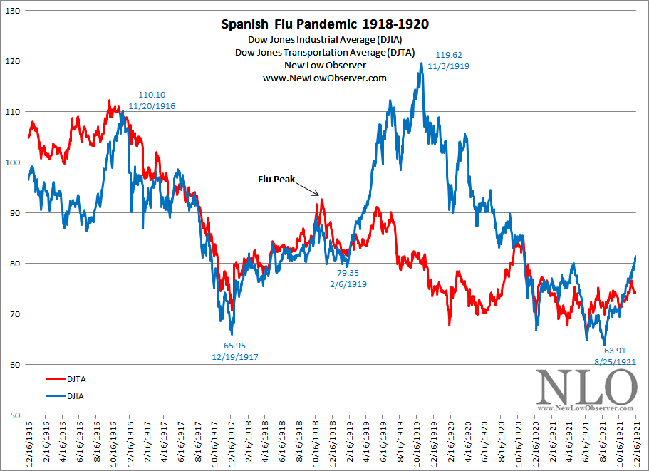 In the last worst case of a flu pandemic, known as the Spanish Flu from 1918 to 1920, we compare the movement of the Dow Jones Industrial Average (DJIA) to the Dow Jones Transportation Average (DJTA).