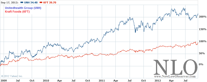 The recent addition of Unitedhealth Group (UNH) to the Dow Industrial Average, replacing Kraft Foods (KFT) exemplifies the "buy" high mentality of those who manage the index. United Health is being added after nearly 215% gains in the stock since the March 2009 low. This compares to "only" a 100% gain in Kraft Foods since the same starting point, see chart below.