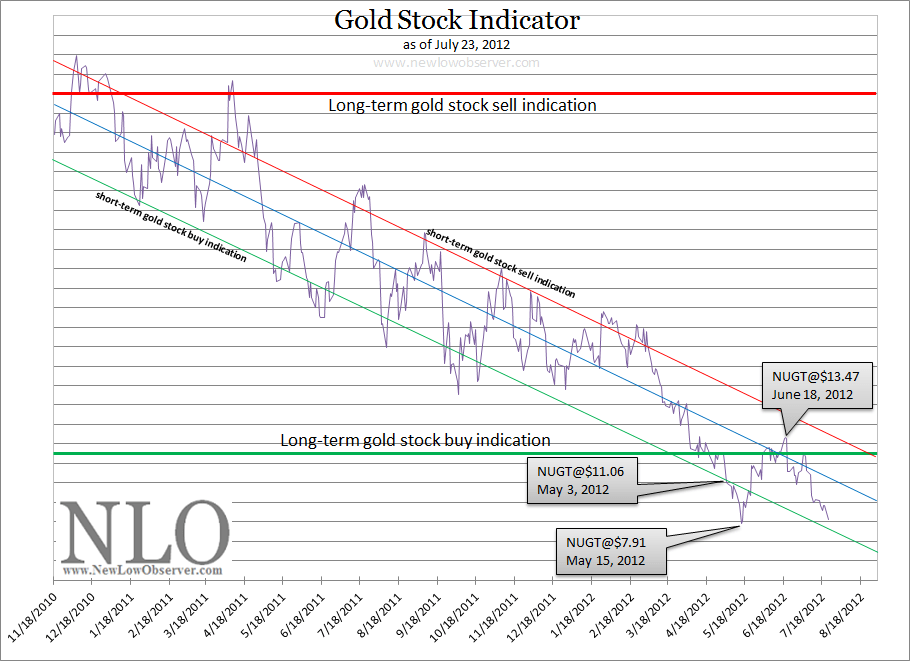 As a caveat, in the same April 4th article, we indicated that “our worst case scenario for a bottom in gold stocks is the period between June 15, 2012 and August 21, 2012.” Presently, it appears that we are on course to achieve such a worse case situation based on the reversal of the rising trend of the Gold Stock Indicator. Our definition of worse case means a gold price of $1,200 to $1,300 and a NUGT price of $4 or less.