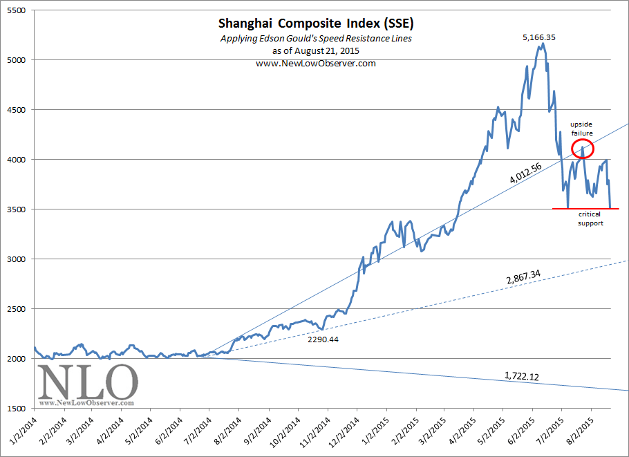 The index to watch in the coming week is the Shanghai Composite Index (SSE) as it represents the raw emotions of the stock market in China. Below we have applied Edson Gould’s Speed Resistance Lines [SRL] to the SSE to determine the potential downside targets to watch for.