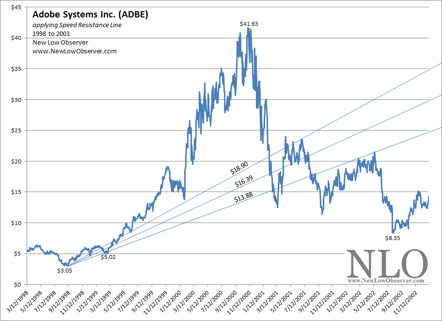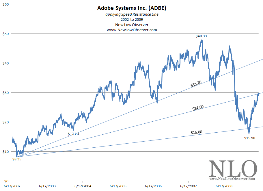 In determining downside targets for Adobe Systems Inc. (ADBE), we have applied Speed Resistance Lines [SRL] to the stock price over multiple periods of increase and subsequent decline. Starting in the 1986 to 1987 period, we see Adobe Systems Inc. increase from $0.21 to as high as $1.69. In the decline that followed, the SRL indicated that the downside targets from the peak price of $1.69 were as follows: