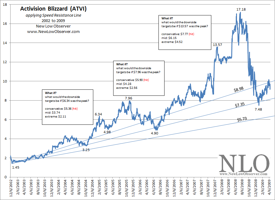 In the period from 2002 to 2009, ATVI increased in price by +1,084%. The decline that followed brought the stock down as much as –56% before a recovery ensued. Again, we have marked off the points where an error of early use of the SRL could have been applied. In each of the three examples, the conservative downside target was achieved. Suffice to say, in the case of the SRL and price peaks, the conservative downside target is a reasonable point of reference for consideration of ATVI.