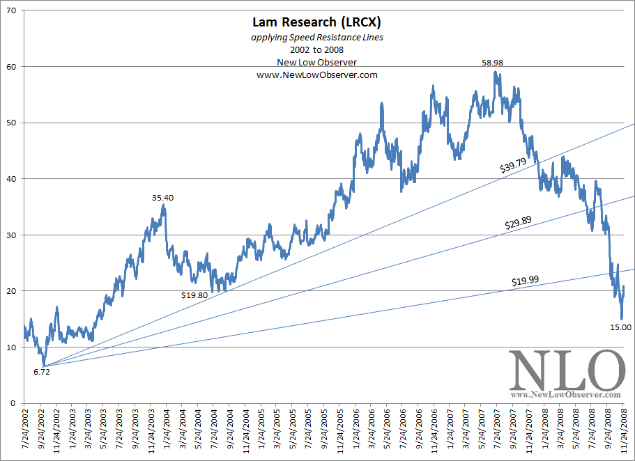 The following is the pattern of price appreciation and decline for Lam Research (LRCX) from 1990 to 2017 with the application of Speed Resistance Lines [SRL].