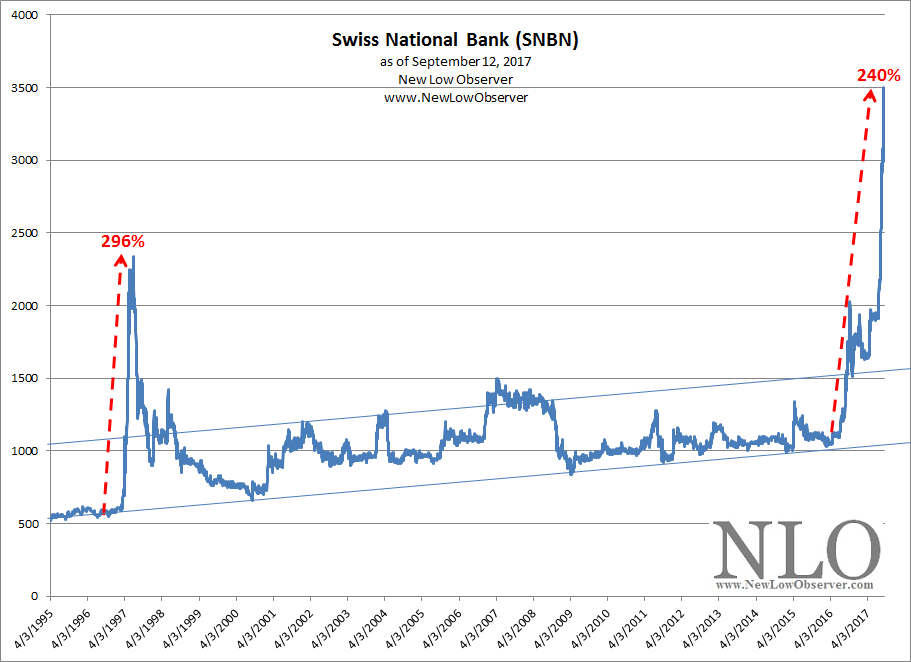In a posting on ZeroHedge there is mention of Swiss National Bank (SNBN) and the “bubble” that seems to be percolating in the stock. We don’t know whether or not the price of the stock is in a bubble. However, what does resonate with us is any sign of a parabolic rise in price. In the case of SNBN, we believe that we can attribute Speed Resistance Lines (SRL) that are consistent with viable downside targets.