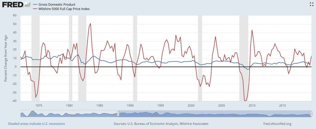 Below is the percentage change on a year-over-year basis for both the GDP and the Wilshire 5000 Index.