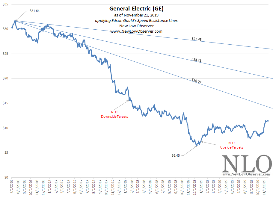 So far, the price of General Electric (GE) has declined approximately –50.62% and has lasted 381 trading days. As seen in the chart below, GE has blasted through Gould’s Speed Resistance Lines at $25.66 and $18.32.