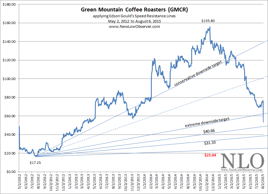 The next stock that we applied the SRL to was Green Mountain Coffee Roasters (GMCR) in our October 25, 2011 review of Edson Gould’s formula. At the time, GMCR was trading at $64.75 after declining –42% from the peak in the stock price on September 19, 2011. There were some who said that the stock was a bargain and should be bought. However, Gould’s SRL indicated that at minimum, GMCR was to decline to $59.93 and possibly decline to the $37.21 level.