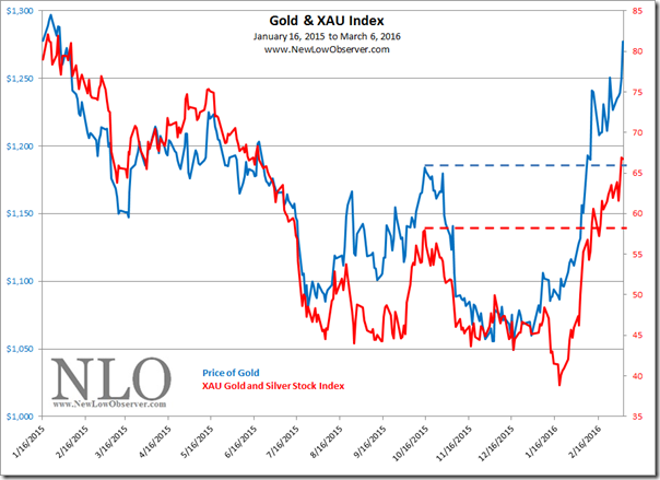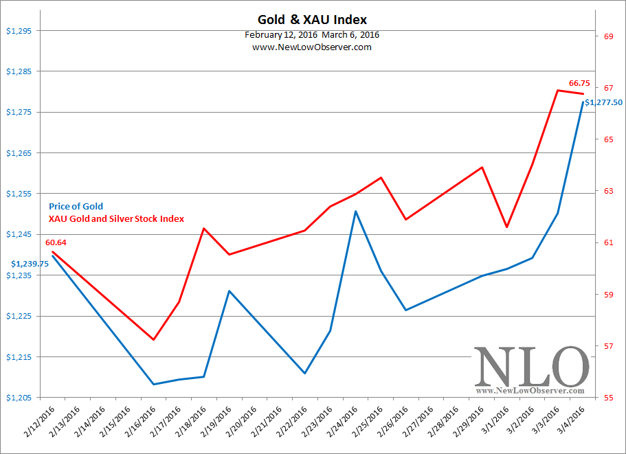 Since our February 12, 2016 posting, the price of gold has increased by +3.04% while the Philadelphia Gold and Silver Stock Index has increased +10.07%.