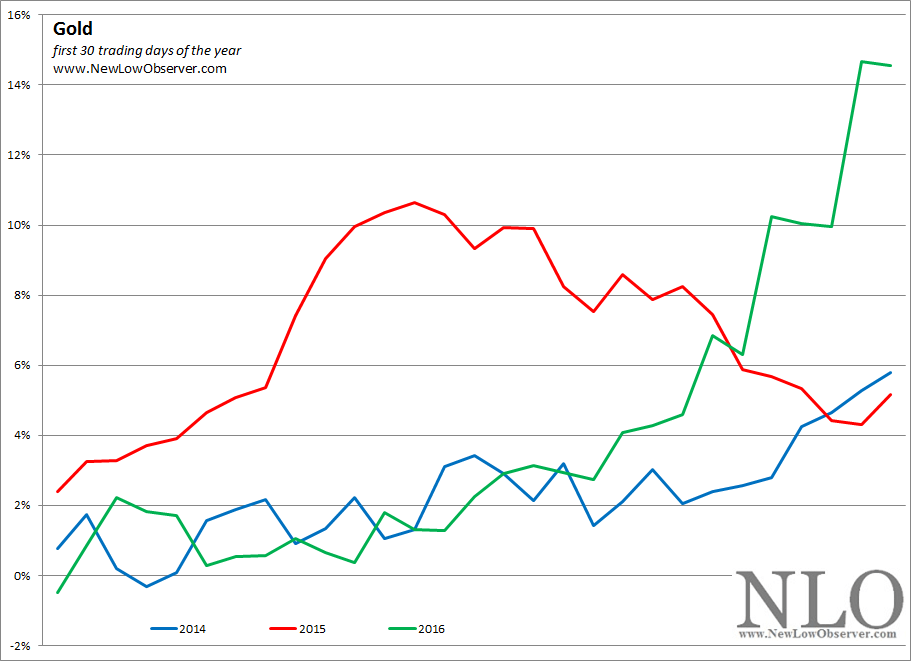 The above chart shows exactly how gold garnered early gains. For 2014, gold ended the year at a loss of –1.55% while the XAU index declined –21.11%. For 2015, gold fell –9.55% and gold stocks fell –35.89%. The early gains for 2016 are nice but new investors should accept what may come if there is a repeat of the last two years.