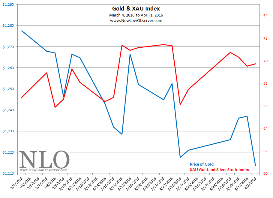 Since our March 2016 posting, the price of gold has decreased by –5.00% while the Philadelphia Gold and Silver Stock Index (XAU) has increased +4.45%.