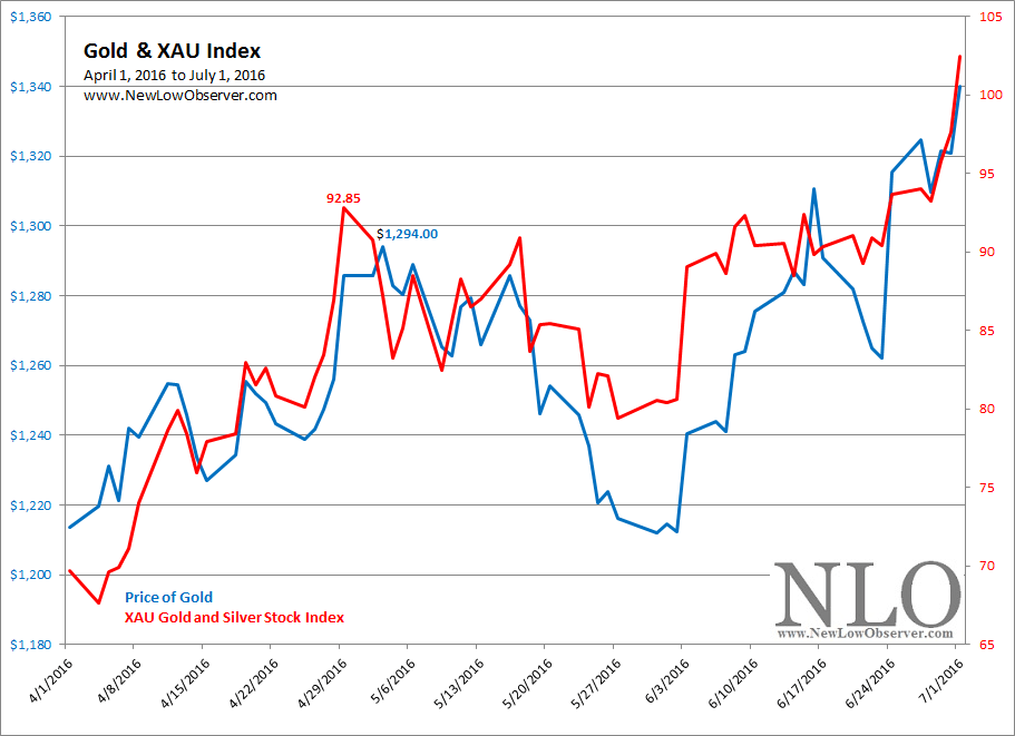 The gold market is off and running. There are many reasons for the current rise in the price of gold but it is all after the fact and may only be guessing at best. It is important to note that “Brexit” has occurred six months from the respective lows in gold and gold precious metal stocks with each rising as much as 28% and 165%, respectively. To our minds, giving credit to the turmoil in the UK for the increase of precious metals is somewhat misplaced and could lead to more wrong conclusions than a single “right” one.