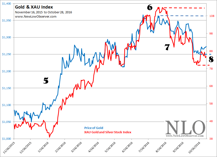 Since our January 2017 posting on gold and precious metals stocks, the price of gold has increased +3.48% while at the same time precious stocks have declined –5.87%. There are some contradictions in the movement of each indicator which we will interpret below.