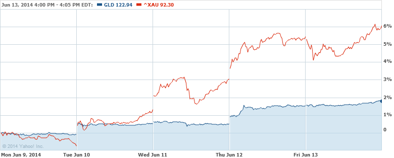 Since May 9, 2014, the gold ETF SPDR Gold Shares has declined –2.55% while the Philadelphia Gold and Silver Stock Index has declined –5.54%.