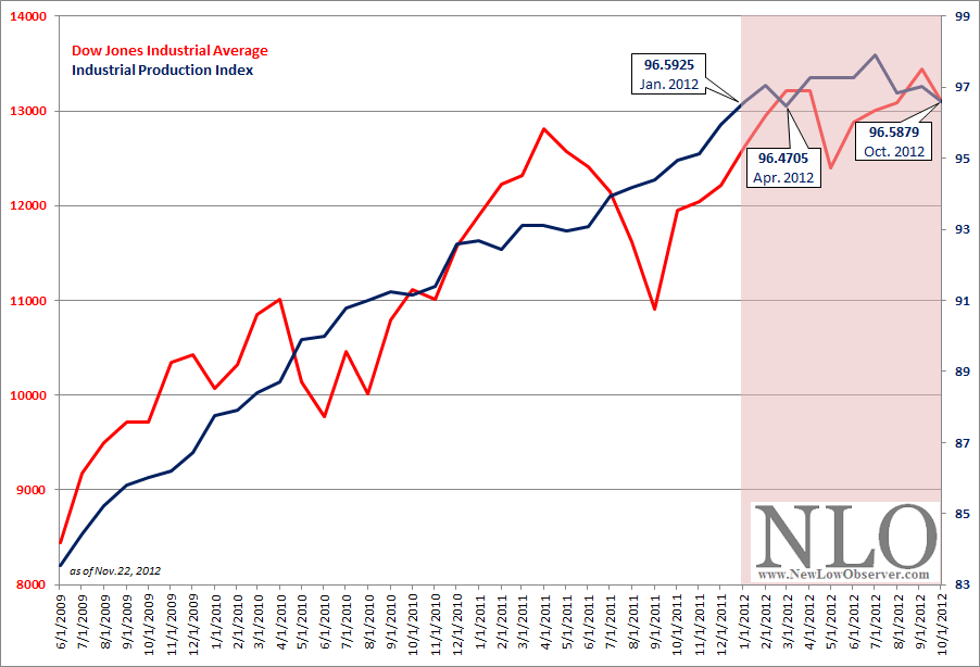 Since January 2012, the Industrial Production Index has traded in a narrow range, based on the revised data. Already the Industrial Production Index is below the July 2012 high and approaching the April 2012 low of 96.4705. Falling below the April low could indicate that the recession had begun as early as January 2012. The Industrial Production Index has not been mired in such a range since the end if the recession was called in June of 2009. Additionally, the preliminary data suggests that the economic recovery has hit a snag and may be on the cusp of a full blown recession (as defined by the National Bureau of Economic Research).