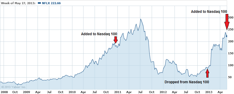 As has been well documented on our site, the Nasdaq OMX has a history of adding and deleting companies on the Nasdaq 100 Index in a manner that is consistent with a money losing speculator. The most recent example of the NASDAQ OMX follies, prior to TSLA, was when Netflix (NFLX) was added to the index after the stock price rose +141.32%…after being dropped from the index on December 24, 2012 (PR here). Not to be outdone by itself, the NASDAQ OMX team previously added NFLX to the Nasdaq 100 on December 20, 2010 (PR here).