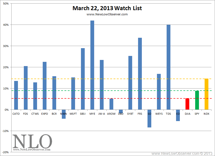 The next Watch List is from March 22, 2013 (found here). The Top Five stocks (CATO, FDS, CTWS, EXPD, BCR) gained an average of +20.78% which was below the +23.12% gained by the entire list. During the same period of time, the Dow Jones Industrial Average gained +12.53%.