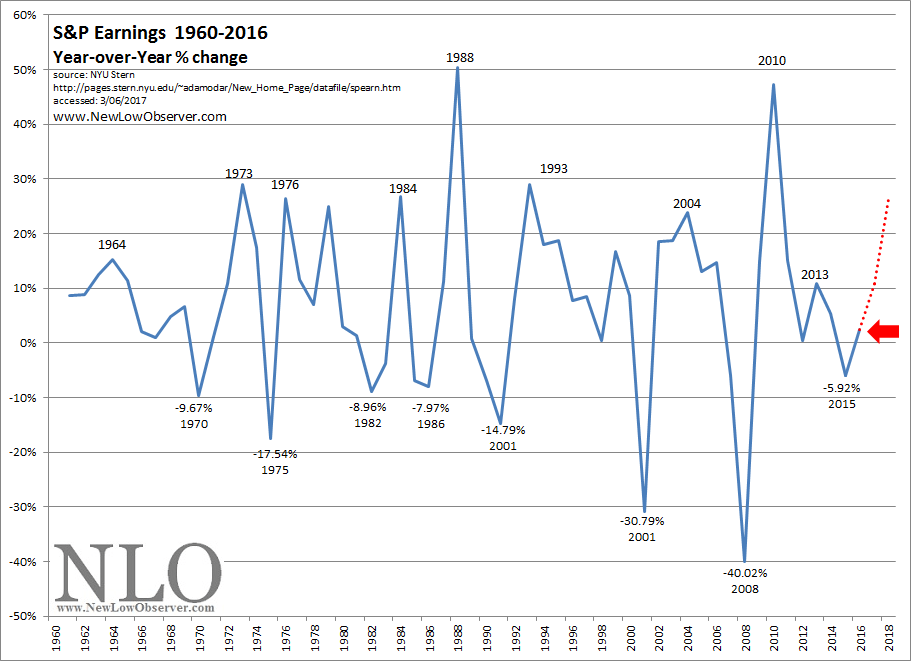The chart below outlines the Year-over-Year (Y-o-Y) percentage change in the S&P 500 earnings since 1960. From what we can tell, the slide from the 2010 peak in Y-o-Y earnings in the S&P may have bottomed in 2015 and is on a path to the 2013 peak which could be followed by the 1964 recovery peak.