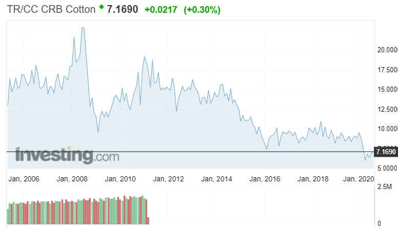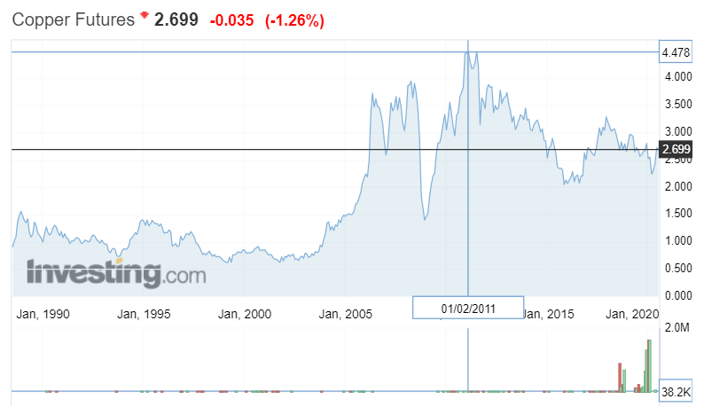 From the charts of cotton and copper below, we can see that copper makes a parabolic move then slowly declines to the low. It is the low that is most characteristic of a turn higher for the stock market rather than the turn lower which can drag out for a long period of time while the stock market continues to climb.
