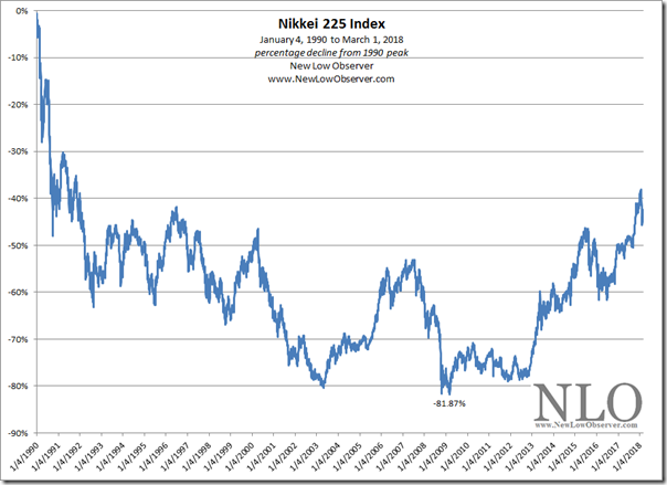 The intervention is actually causing the process of recovery to take longer than it needs to by providing false hope for investors (large and small) that the turnaround is near. We’ve seen this all before in the Japanese Nikkei Index from 1990 to 2009 when it declined –81% (chart here).