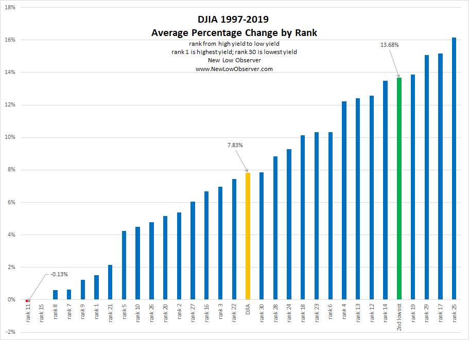 So, in order to stretch the concept even further, we’ve ranked the 30 stocks of the Dow Jones Industrial Average from highest yielding to lowest yielding in the period from 1997 to 2019. Then, we compared the individual ranks for each year to determine the average rate of change for that specific ranking. Below is the graphing of the individual performance with the stock ranked number 1 being the highest yielding while the stock ranked 30 being the lowest yielding from 1997-2019.