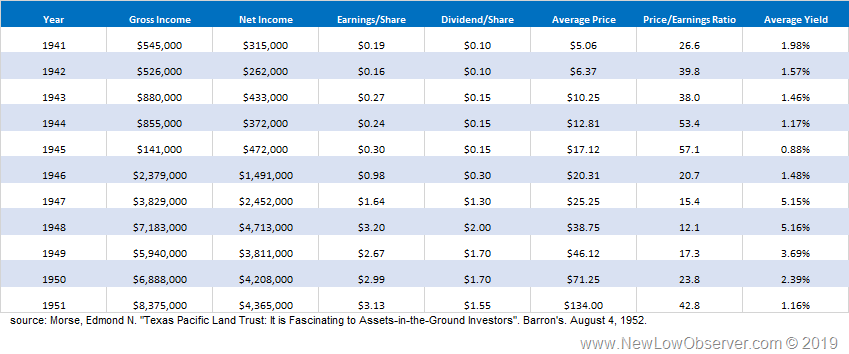 The numbers for Texas Pacific Land Trust (TPL) are generally staggering. However, looking at the 1941 to 1951 and 1958 to 1967 data below puts the current activity in TPL, from the 2015 low to the 2018 peak, into perspective.