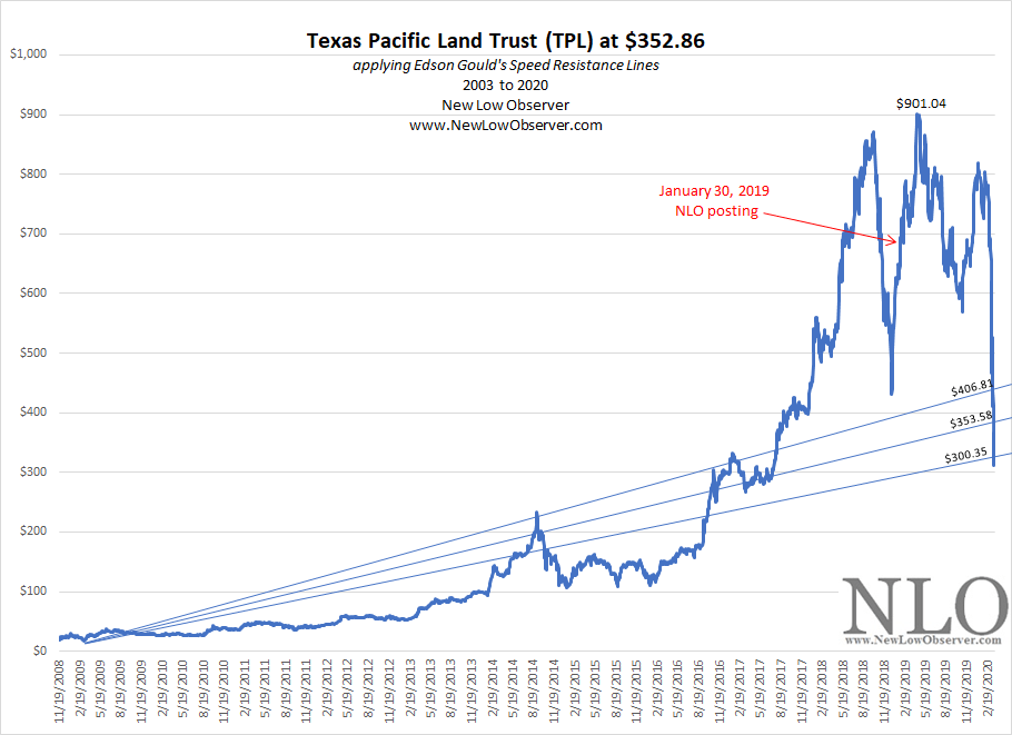 Using past as precedent, we looked at the Speed Resistance Lines [SRL] as outlined by Edson Gould in the period from 2003 to 2016. First, we remind our readers that under the extraordinary period of panic, from June 29, 2007 to March 9, 2009, TPL saw a decline of -72%.