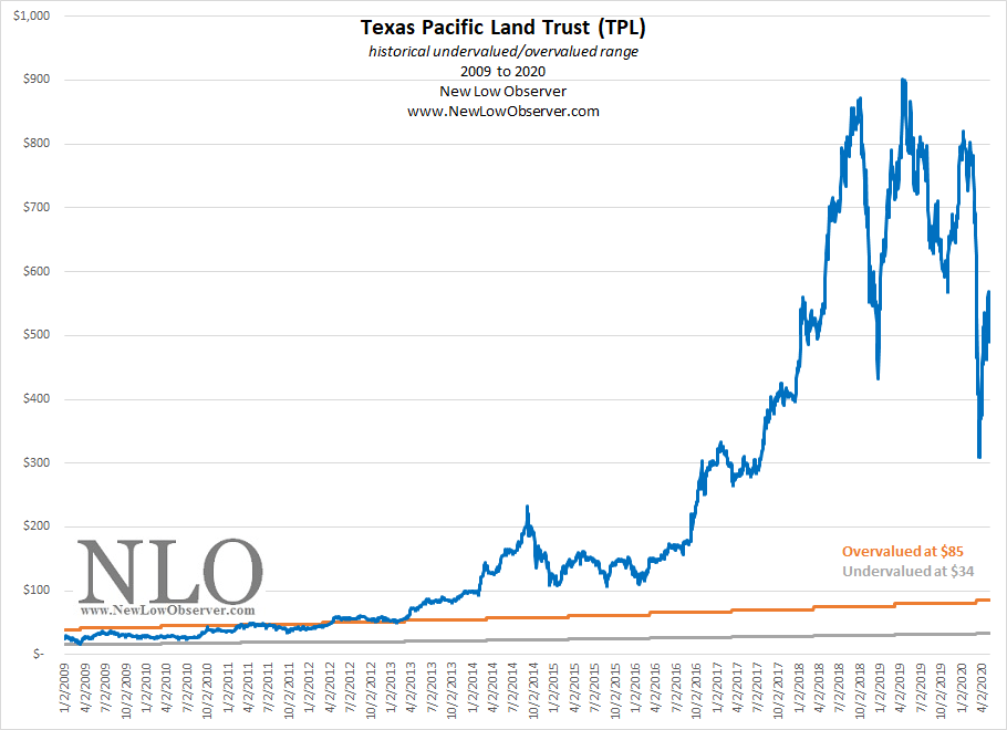 “The minimum downside target is in a range of $397.12 to $401.00. Going back to the period of 2007 to 2009, if TPL were to decline in a similar magnitude, the downside target from the $871.99 peak would be $244.16.”