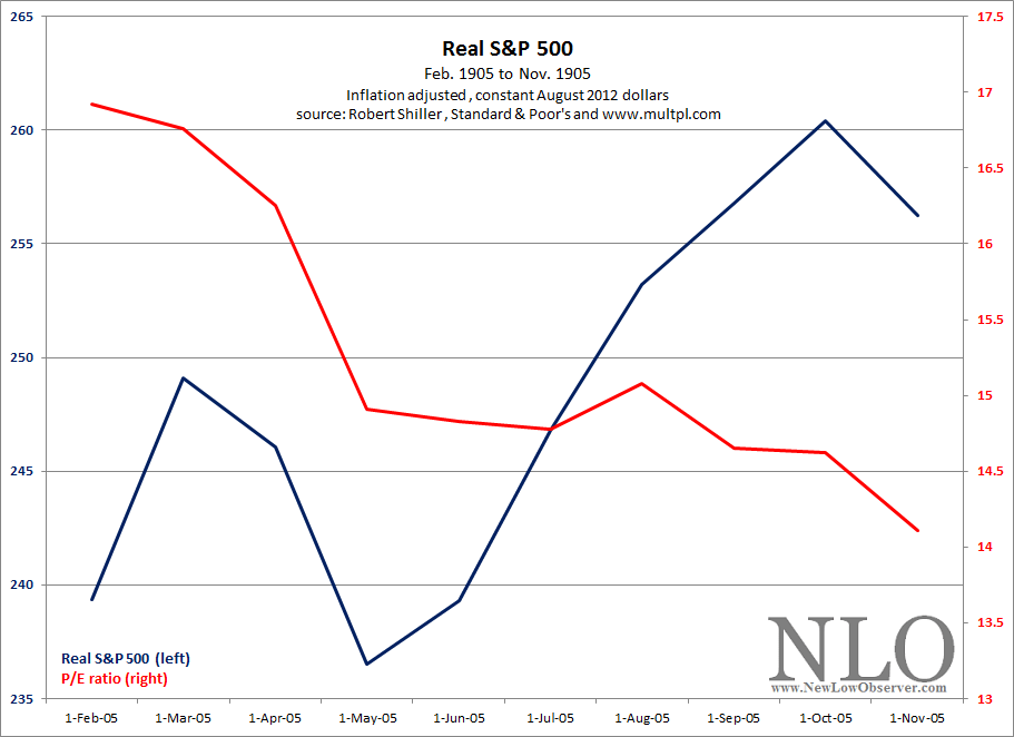 Starting with the first example of an inverse relationship between the S&P 500 and the p/e ratio (data compiled by Robert Schiller; S&P 500 index did not exist before 1957) was the period of 1905 as seen in the chart below.