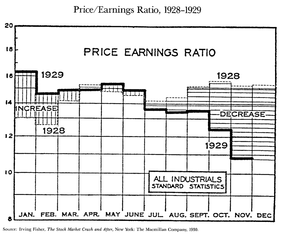 Another significant period when the p/e ratio of the market declined in the face of a rising market was January 1929 to November 1929. During this period, The Dow Industrials increased from 296 to 381 and the real S&P 500 increased from 311 to 416, or 27% and +33%, respectively. The chart below shows the p/e ratio for ALL S&P Industrials in the period from January 1928 to November 1929 (source: Fisher, Kenneth. The Wall Street Waltz. Contemporary Books, Chicago. 1987. page 68-69).