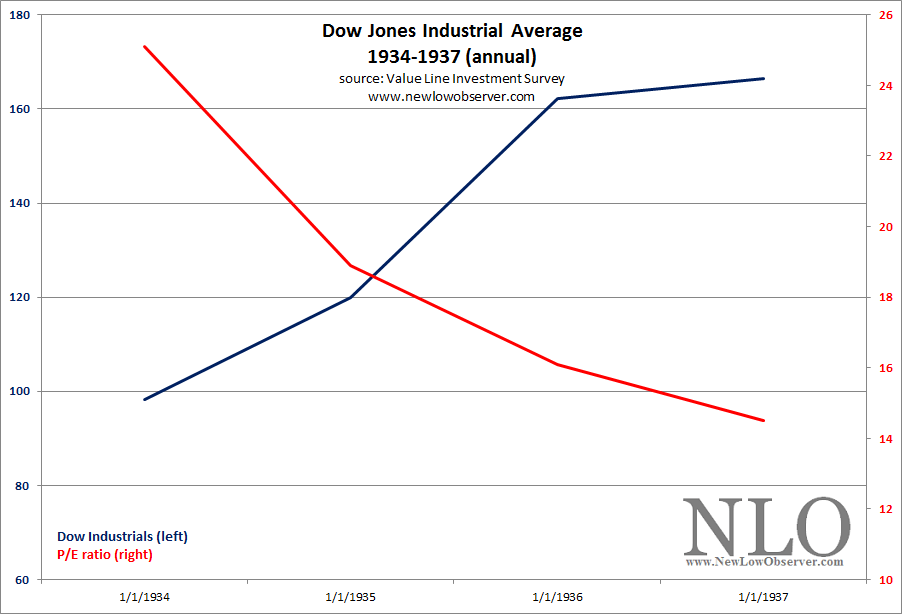 The next period of a clear inverse relationship between the stock market and the p/e ratio was from 1934 to 1937 as indicated in the chart of the Dow Jones Industrial Average below.