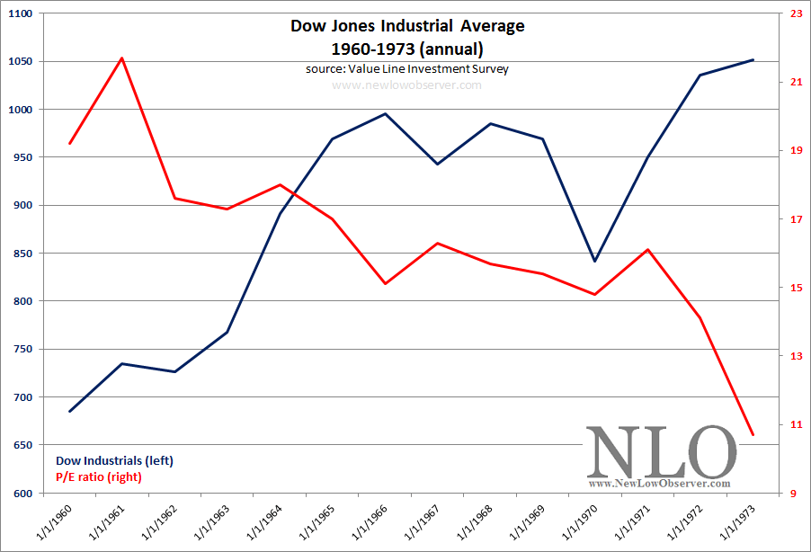 The next period of divergence between the stock market and its respective p/e ratio was from 1960 to 1973 when the Dow Industrials rose from 700 to 1,050 as the p/e ratio declined from 21 times to 11 times. The Dow Jones Industrial Average was not able to meaningfully exceed the 1,000 mark until 1982.