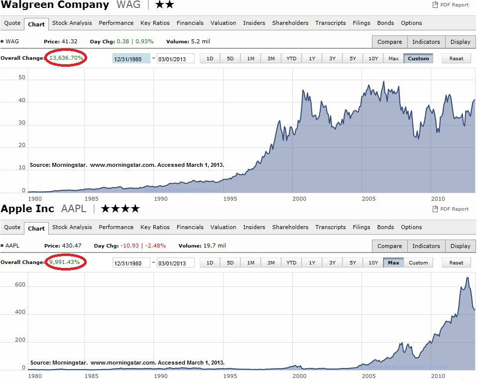 Below is a comparison of the performance of Apple (AAPL) against Walgreen (WAG) from the IPO of Apple back in December 1980. Circled in red is the total return of Walgreen at +13,636.70% versus +9,991.43% for Apple.